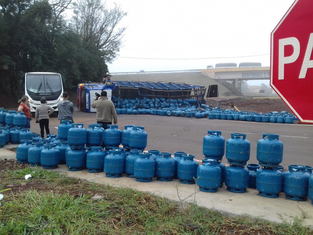 Um caminhão carregado de botijões de gás tombou na manhã desta terça-feira (01) na Pr-218 em Arapongas. Equipe do Corpo…